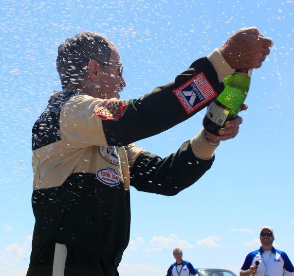 spraying champagne after winning at High Plains Raceway. Photo by Bill